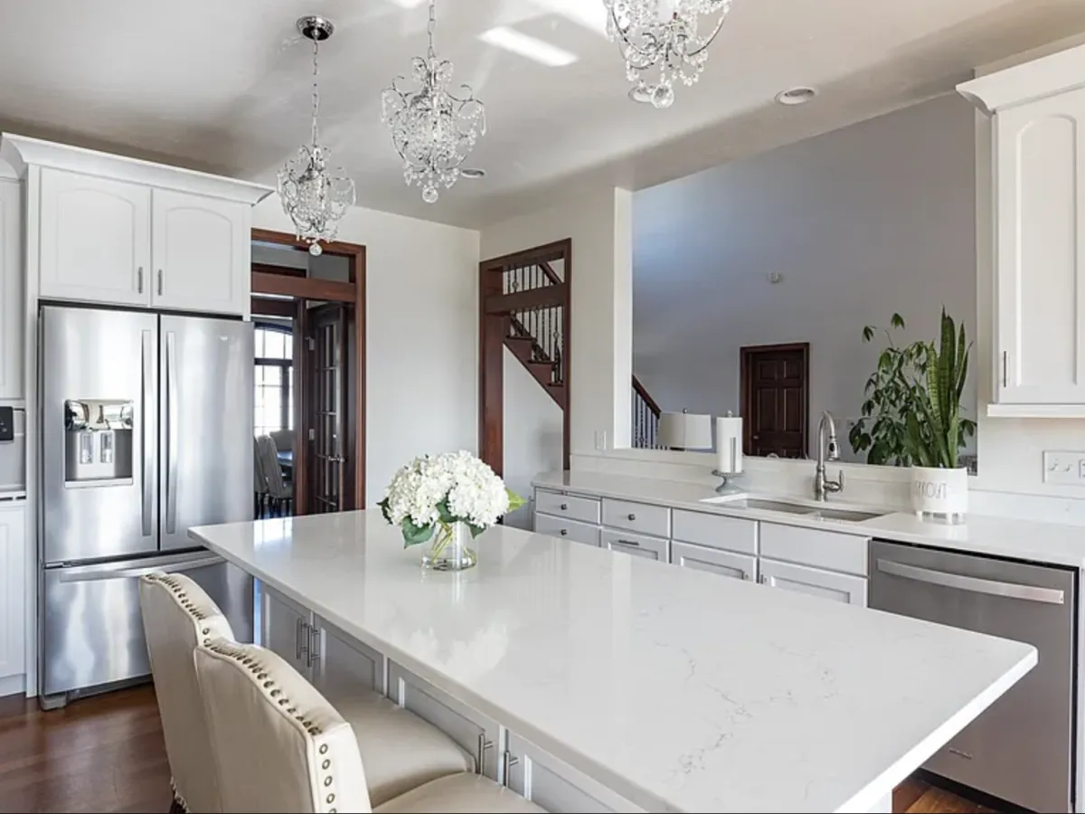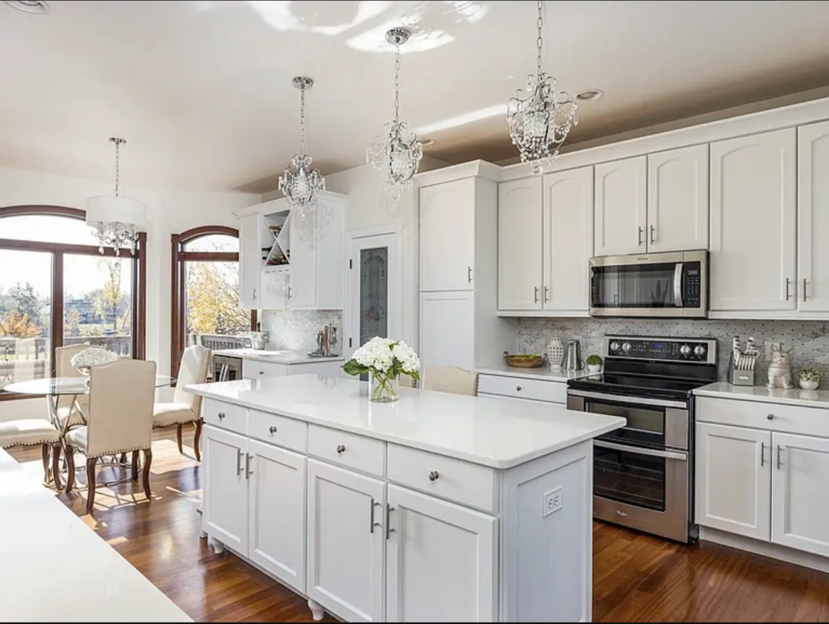 Updated White Kitchen with backsplash, quartz countertops, wet bar, and newer appliances